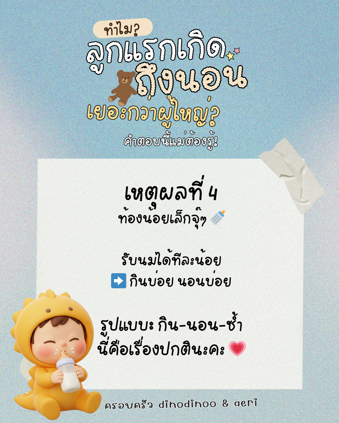 ท้องน้อยของลูกเล็กมาก รับนมได้ทีละน้อย จึงต้องตื่นกินนมบ่อยๆ แล้วก็นอนต่อ รูปแบบการนอน "กิน-นอน-ซ้ำ" นี้เป็นเรื่องปกติมากค่ะ