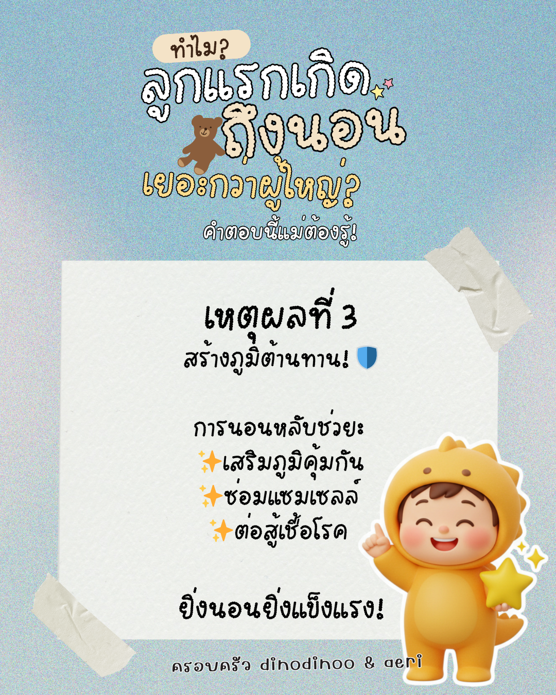 ตอนน้องหลับสนิท ร่างกายจะหลั่งฮอร์โมนการเจริญเติบโตเต็มที่ นี่คือเหตุผลที่เราว่า "เด็กโตตอนหลับ" นั่นเองค่ะ นอกจากนี้การนอนยังช่วยเสริมสร้างภูมิคุ้มกัน ทำให้น้องแข็งแรงขึ้นทุกวัน